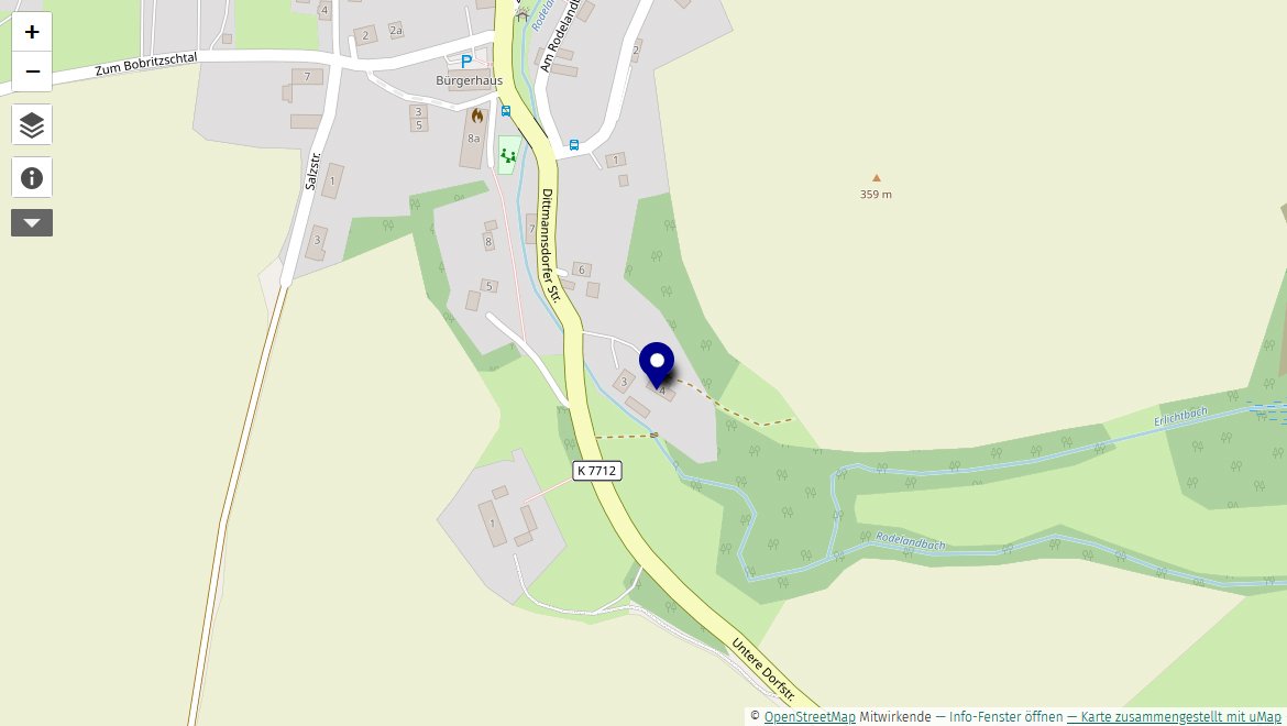 Aus Richtung Dresden oder Freiberg kommend (B173) biegen Sie in Niederschöna ab in die Untere Dorfstraße Richtung Oberschaar. Dort biegen Sie in der Dittmannsdorfer Straße kurz hinter der Brücke über den Rodelandbach rechts ab und folgen der Straße bis zum Ende.